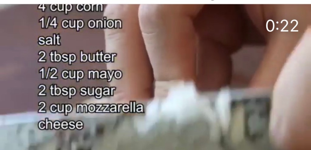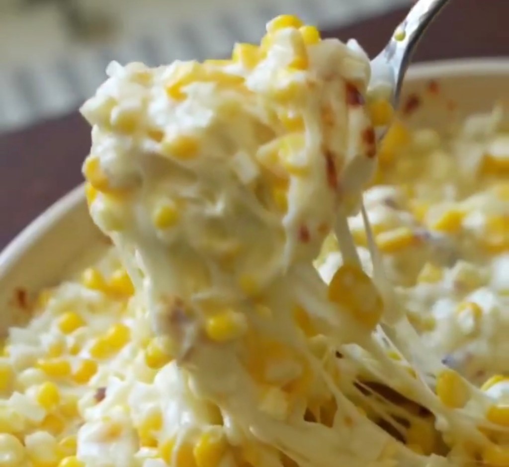 Sauté 1/4 cup of chopped onion. Add corn and sauté again add 1/2 cup mayo and 2 tsp sugar. Mix well. Pour into baking dish and sprinkle 2 cups of grated mozzarella cheese on top and bake until bubbly